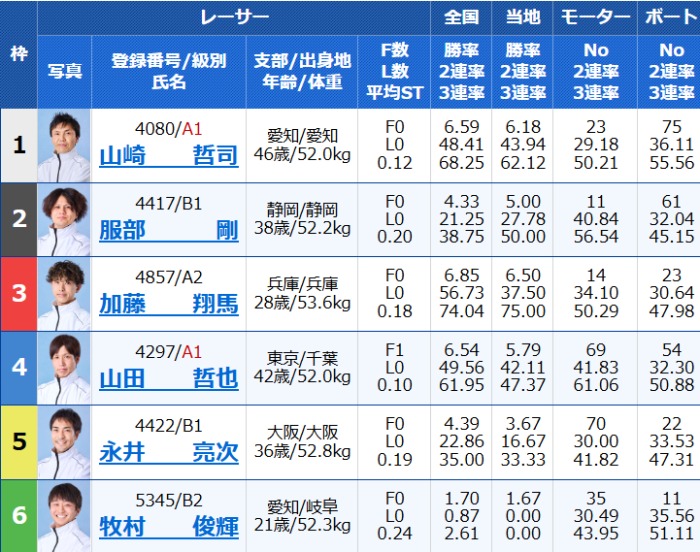 - 山口剛⇒勝率の高さと平均STが0.12が捲る可能性あり