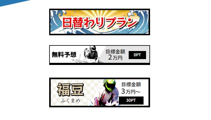| プラン名 | 提供レース数 | 買い目点数 | 想定投資額 | 目標獲得金額 | 必要PT | 備考 |